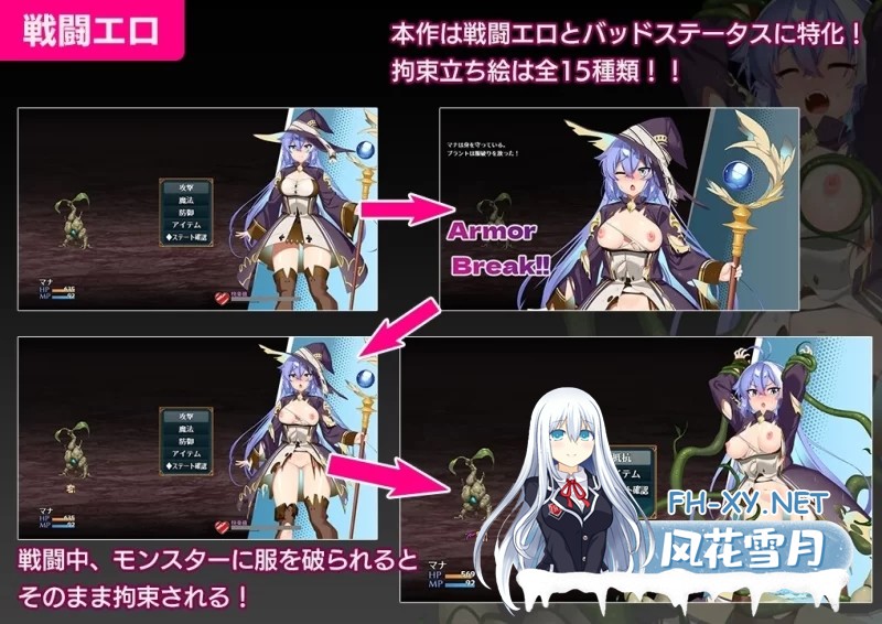 战斗过程中,迷宫中潜伏的危险魔物会撕裂玛娜的衣物并将其拘束。